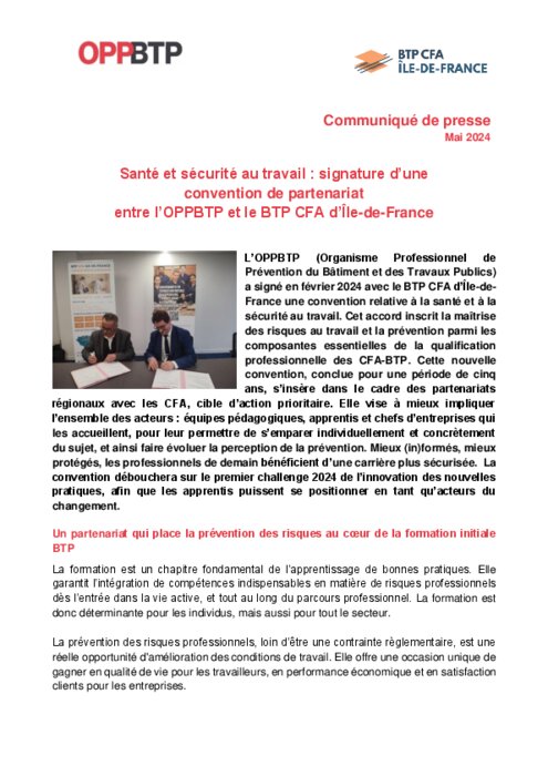 L’OPPBTP (Organisme Professionnel de Prévention du Bâtiment et des Travaux Publics) a signé en février 2024 avec le BTP CFA d’Île-de-France une convention relative à la santé et à la sécurité au travail. Cet accord inscrit la maîtrise des risques au travail et la prévention parmi les composantes essentielles de la qualification professionnelle des CFA-BTP.