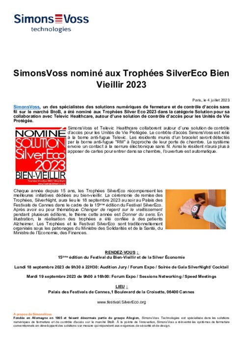SimonsVoss, un des spécialistes des solutions numériques de fermeture et de contrôle d’accès sans fil sur le marché BtoB, a été nominé aux Trophées Silver Eco 2023 dans la catégorie Solution pour sa collaboration avec Televic Healthcare, autour d’une solution de contrôle d’accès pour les Unités de Vie Protégée.