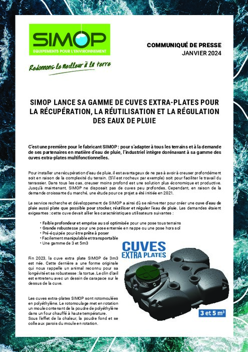 C’est une première pour le fabricant SIMOP : pour s’adapter à tous les terrains et à la demande de ses partenaires en matière d’eau de pluie, l’industriel intègre dorénavant à sa gamme des cuves extra-plates multifonctionnelles.