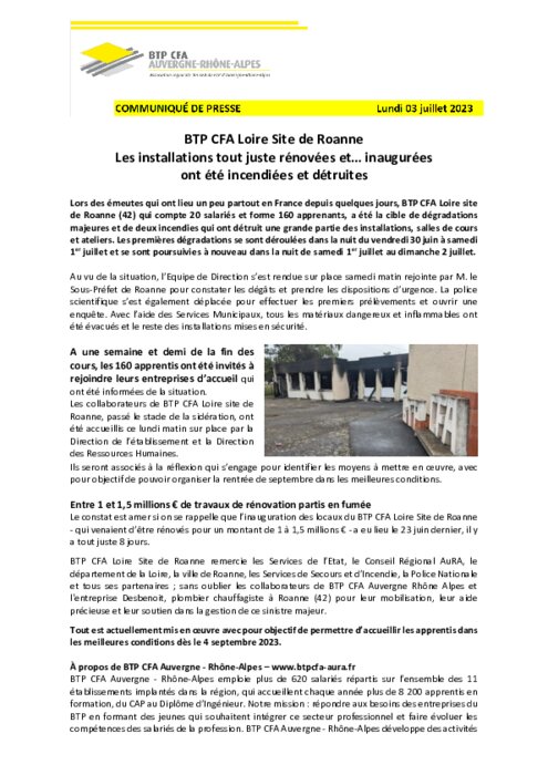 Lors des émeutes qui ont lieu un peu partout en France depuis quelques jours, BTP CFA Loire site de Roanne (42) qui compte 20 salariés et forme 160 apprenants, a été la cible de dégradations majeures et de deux incendies qui ont détruit une grande partie des installations, salles de cours et ateliers. Les premières dégradations se sont déroulées dans la nuit du vendredi 30 juin à samedi 1er juillet et se sont poursuivies à nouveau dans la nuit de samedi 1er juillet au dimanche 2 juillet.