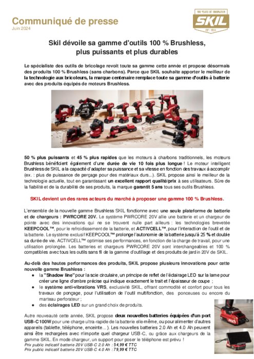 Le spécialiste des outils de bricolage revoit toute sa gamme cette année et propose désormais des produits 100 % Brushless (sans charbons). Parce que SKIL souhaite apporter le meilleur de la technologie aux bricoleurs, la marque centenaire remplace toute sa gamme d’outils à batterie avec des produits équipés de moteurs Brushless.