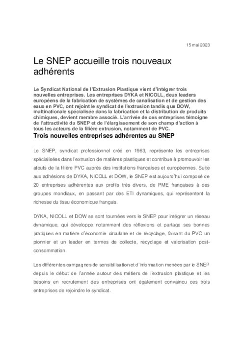 Le Syndicat National de l’Extrusion Plastique vient d’intégrer trois nouvelles entreprises. Les entreprises DYKA et NICOLL, deux leaders européens de la fabrication de systèmes de canalisation et de gestion des eaux en PVC, ont rejoint le syndicat de l’extrusion tandis que DOW, multinationale spécialisée dans la fabrication et la distribution de produits chimiques, devient membre associé.