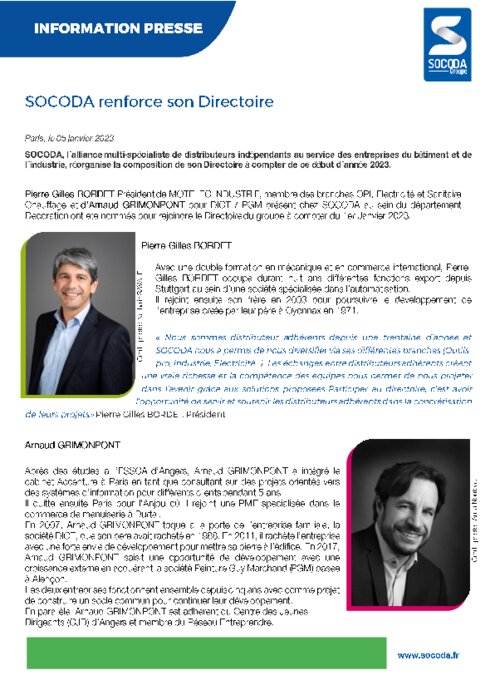Institutionnels 05 janvier 2023 - 07:51 SOCODA, l’alliance multi-spécialiste de distributeurs indépendants au service des entreprises du bâtiment et de l’industrie, réorganise la composition de son Directoire à compter de ce début d’année 2023. PDF (626 Ko) Télécharger