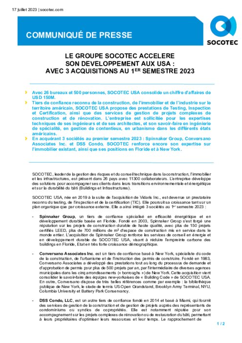 Industriels 17 juillet 2023 - 08:58 En acquérant 3 sociétés au premier semestre 2023 : Spinnaker Group, Conversano Associates Inc. et DSS Condo, SOCOTEC renforce encore son expertise sur l’immobilier existant, ainsi que ses positions en Floride et à New York. PDF (109 Ko) Télécharger