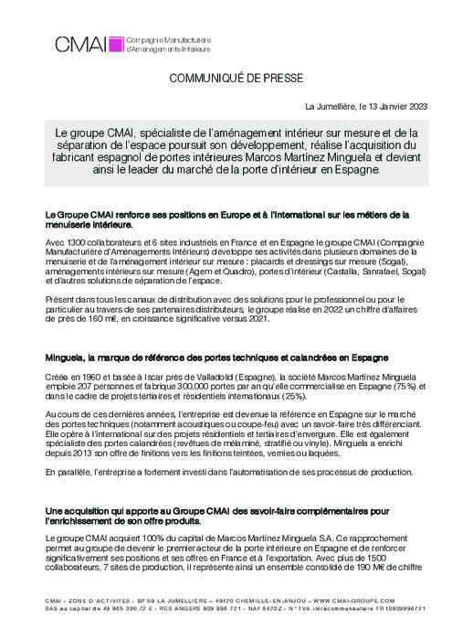 Le Groupe CMAI – détenteur des marques Sogal, Agem et Quadro, acquiert le fabricant espagnol de portes intérieures Minguela la marque de référence des portes techniques et calandrées en Espagne. Il renforce ainsi ses positions en Europe et à l’International sur les métiers de la menuiserie intérieure.