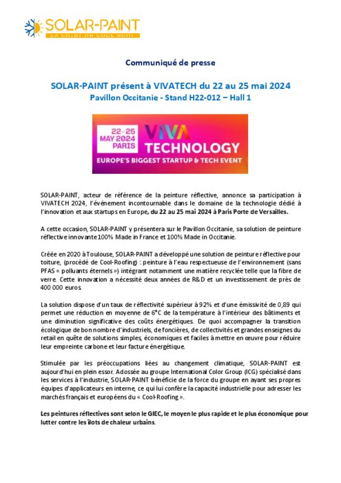 Solar-Paint, acteur de référence de la peinture réflective, annonce sa participation à Vivatech 2024, l’événement incontournable dans le domaine de la technologie dédié à l’innovation et aux startups en Europe, du 22 au 25 mai 2024 à Paris Porte de Versailles.