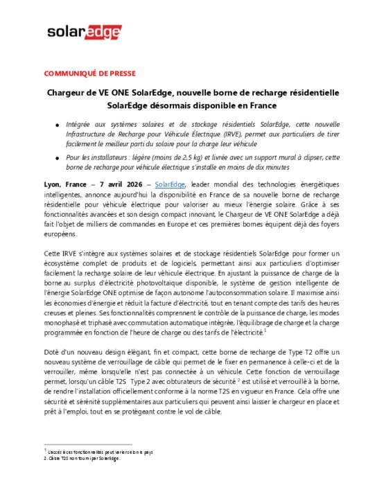 SolarEdge, leader mondial des technologies énergétiques intelligentes, annonce aujourd'hui la disponibilité en France de sa nouvelle borne de recharge résidentielle pour véhicule électrique pour valoriser au mieux l’énergie solaire. Grâce à ses fonctionnalités avancées et son design compact innovant, le Chargeur de VE ONE SolarEdge a déjà fait l'objet de milliers de commandes en Europe et ces premières bornes équipent déjà des foyers européens.
