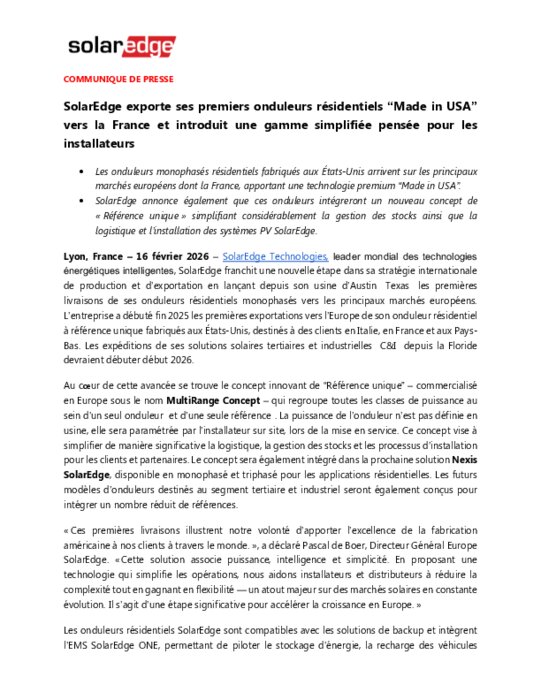 SolarEdge Technologies, leader mondial des technologies énergétiques intelligentes, SolarEdge franchit une nouvelle étape dans sa stratégie internationale de production et d’exportation en lançant depuis son usine d’Austin (Texas) les premières livraisons de ses onduleurs résidentiels monophasés vers les principaux marchés européens. L’entreprise a débuté fin 2025 les premières exportations vers l’Europe de son onduleur résidentiel à référence unique fabriqués aux États-Unis, destinés à des clients en Italie, en France et aux Pays-Bas. Les expéditions de ses solutions solaires tertiaires et industrielles (C&I) depuis la Floride devraient débuter début 2026.