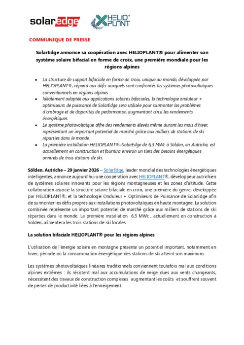 SolarEdge, leader mondial des technologies énergétiques intelligentes, annonce aujourd’hui une coopération avec Helioplant, développeur autrichien de systèmes solaires innovants pour les régions montagneuses et les zones d’altitude. Cette collaboration associe la structure solaire bifaciale en croix, une première du genre, développée par Helioplant, et la technologie Onduleur + Optimiseurs de Puissance de SolarEdge afin de surmonter les défis propres aux installations photovoltaïques en haute montagne. La solution combinée représente un important potentiel de marché grâce aux milliers de stations de ski réparties dans le monde. La première installation (6,3 MWc), actuellement en construction à Sölden, alimentera les trois stations de ski locales.