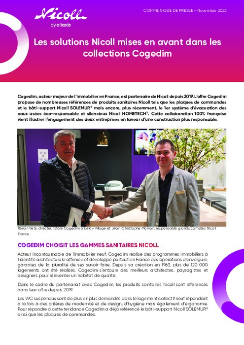 Cogedim, acteur majeur de l’immobilier en France, est partenaire de Nicoll depuis 2019. L’offre Cogedim propose de nombreuses références de produits sanitaires Nicoll telles que les plaques de commandes et le bâti-support Nicoll SOLEMUR mais encore, plus récemment, le 1er système d’évacuation des eaux usées éco-responsable et silencieux Nicoll HOMETECH. Cette collaboration 100% française vient illustrer l’engagement des deux entreprises en faveur d’une construction plus responsable.