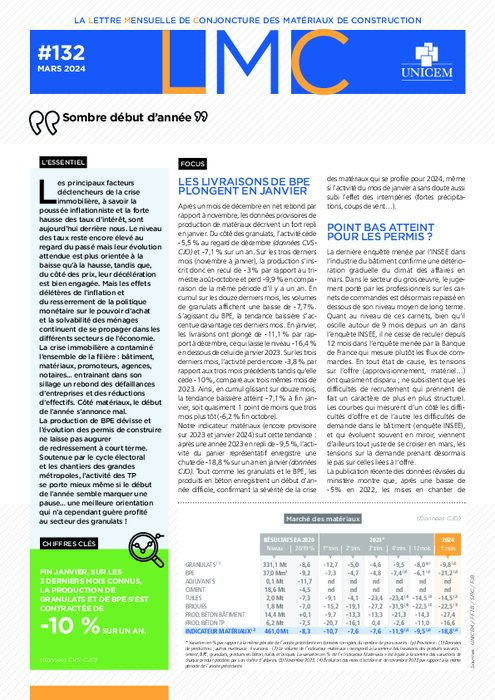 Après un mois de décembre en net rebond par rapport à novembre, les données provisoires de production de matériaux décrivent un fort repli en janvier. Du côté des granulats, l’activité cède -5,5% au regard de décembre (données CVS-CJO) et -7,1% sur un an. Sur les trois derniers mois (novembre à janvier), la production s’inscrit donc en recul de -3% par rapport au trimestre août-octobre et perd -9,9% en comparaison de la même période d’il y a un an.