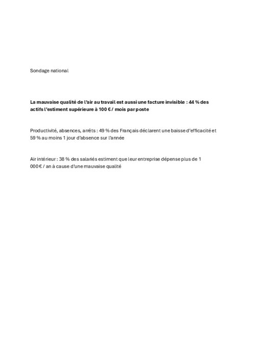 OberA a interrogé 3 100 actifs en France, afin de fournir des données chiffrées sur l’impact concret de l’absence de gestion de l’air — symptômes, absentéisme, baisse de productivité, temps perdu et coûts directs — et d’en mesurer la facture réelle pour les entreprises.