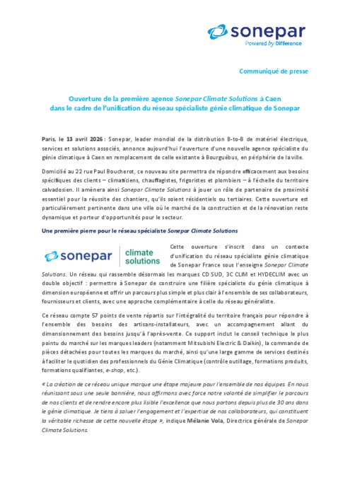 Sonepar, leader mondial de la distribution aux professionnels de matériels électriques, a récemment annoncé l'unification de son réseau de spécialiste du génie climatique sous le nom de Sonepar Climate Solutions.