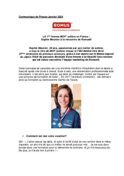 Sophie Meunier, 30 ans, passionnée par son métier de solière, a reçu le titre de MOF (solière niveau 4) l’été dernier lors de la 27ème cérémonie du précieux concours, grâce à son œuvre sur le thème imposé du Japon. Récit du parcours étonnant d’une femme à la ténacité hors normes qui est venue rencontrer l’équipe marketing de Romus.