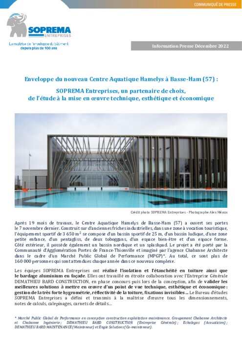 Les équipes SOPREMA Entreprises ont réalisé l’isolation et l’étanchéité en toiture ainsi que le bardage aluminium en façade. Elles ont travaillé en étroite collaboration avec l’Entreprise Générale DEMATHIEU BARD CONSTRUCTION, en phase concours puis lors de la conception, afin de valider les meilleures solutions à mettre en œuvre d’un point de vue technique, esthétique et économique : gestion de la très forte hygrométrie, réflectivité de la toiture, fixations invisibles...
