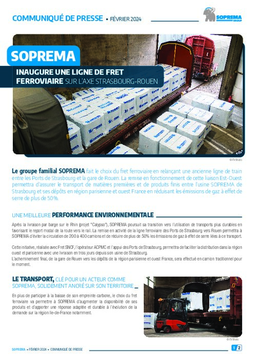 Le groupe familial Soprema fait le choix du fret ferroviaire en relançant une ancienne ligne de train entre les Ports de Strasbourg et la gare de Rouen. La remise en fonctionnement de cette liaison Est-Ouest permettra d’assurer le transport de matières premières et de produits finis entre l’usine Soprema de Strasbourg et ses dépôts en région parisienne et ouest France, tout en réduisant les émissions de gaz à effet de serre de plus de 50 %.