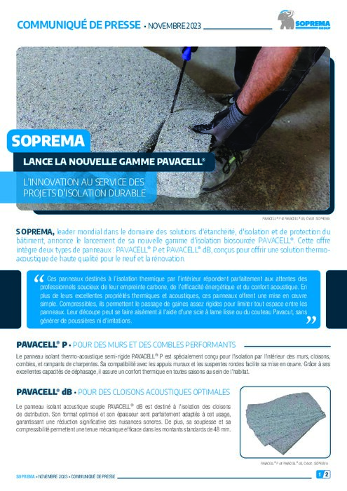 SOPREMA, leader mondial dans le domaine des solutions d'étanchéité, d'isolation et de protection du bâtiment, annonce le lancement de sa nouvelle gamme d'isolation biosourcée PAVACELL. Cette offre intègre deux types de panneaux : PAVACELL P et PAVACELL dB, conçus pour offrir une solution thermo-acoustique de haute qualité pour le neuf et la rénovation.