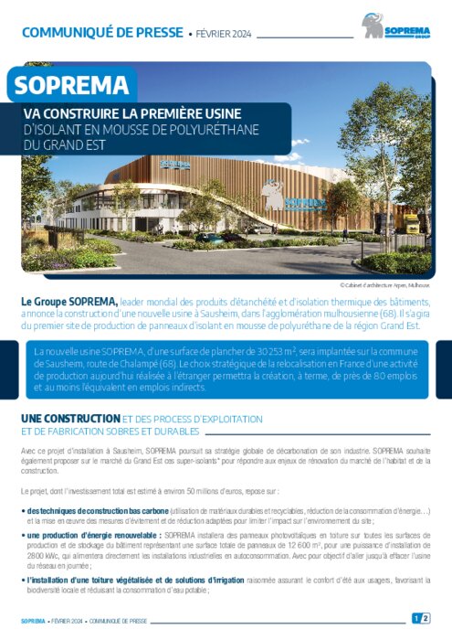 Le Groupe SOPREMA, leader mondial des produits d’étanchéité et d’isolation thermique des bâtiments, annonce la construction d’une nouvelle usine à Sausheim, dans l’agglomération mulhousienne (68). Il s’agira du premier site de production de panneaux d’isolant en mousse de polyuréthane de la région Grand Est.