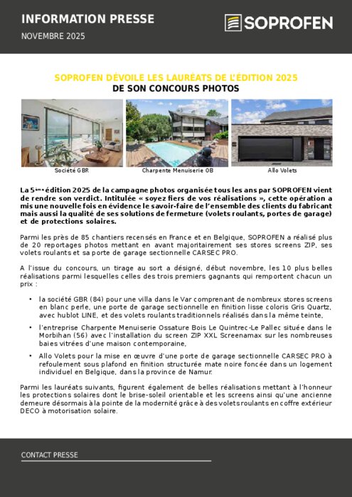 La 5e édition de la campagne photos organisée tous les ans par Soprofen vient de rendre son verdict. Intitulée « soyez fiers de vos réalisations », cette opération a mis une nouvelle fois en évidence le savoir-faire de l’ensemble des clients du fabricant mais aussi la qualité de ses solutions de fermeture (volets roulants, portes de garage) et de protections solaires.