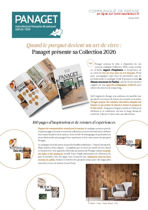 Support de communication central pour la marque, le catalogue consacre près de cinquante pages à la mise en scène des collections, à travers des ambiances réalisées dans toutes les pièces de la maison. Il est enrichi de témoignages de particuliers et de professionnels, qui partagent leur expérience et leur vécu autour des parquets Panaget.