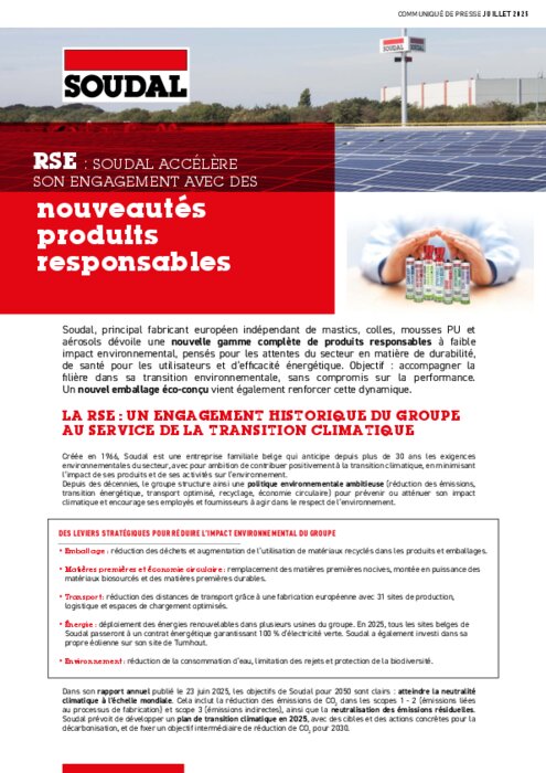 Soudal, principal fabricant européen indépendant de mastics, colles, mousses PU et aérosols dévoile une nouvelle gamme complète de produits responsables à faible impact environnemental, pensés pour les attentes du secteur en matière de durabilité, de santé pour les utilisateurs et d’efficacité énergétique. Objectif : accompagner la filière dans sa transition environnementale, sans compromis sur la performance. Un nouvel emballage éco-conçu vient également renforcer cette dynamique.
