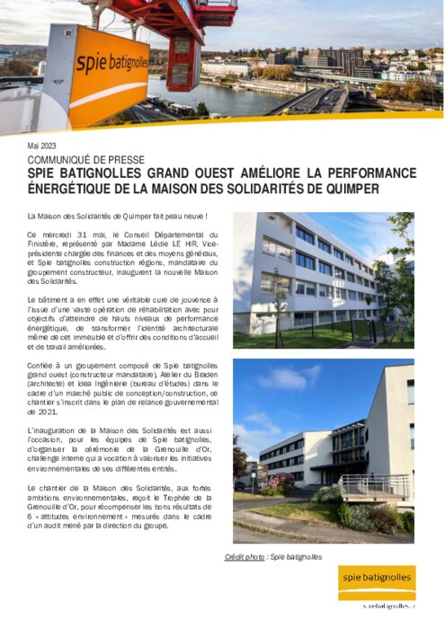 Ce mercredi 31 mai, le Conseil Départemental du Finistère, représenté par Madame Lédie LE HIR, Vice-présidente chargée des finances et des moyens généraux, et Spie batignolles construction régions, mandataire du groupement constructeur, inaugurent la nouvelle Maison des Solidarités.