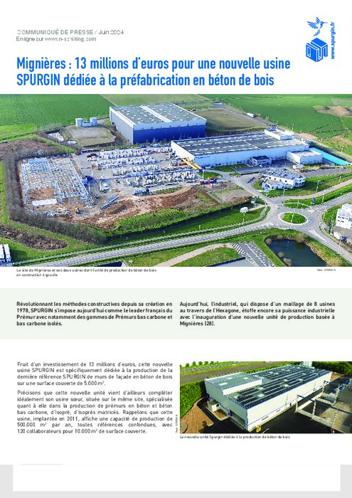 Révolutionnant les méthodes constructives depuis sa création en 1978, SPURGIN s’impose aujourd’hui comme le leader français du Prémur avec notamment des gammes de Prémurs bas carbone et bas carbone isolés. Aujourd’hui, l’industriel, qui dispose d’un maillage de 8 usines au travers de l’Hexagone, étoffe encore sa puissance industrielle avec l‘inauguration d’une nouvelle unité de production basée à Mignières (28).