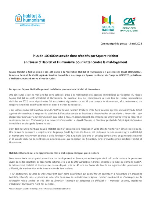 Square Habitat a fait un don de 101 535 euros à la Fédération Habitat et Humanisme en présence de David Chouraqui, directeur général de Crédit Agricole Services Immobiliers en charge de Square Habitat et de Françoise Delvoye, présidente d’Habitat et Humanisme Nord-Pas-de-Calais.