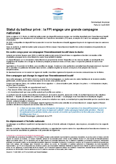 Entré en vigueur le 21 février, le statut de bailleur privé (ou dispositif Jeanbrun) marque une évolution importante pour l’investissement locatif. Pour accompagner son déploiement, la Fédération des promoteurs immobiliers (FPI) lance, à compter du 2 avril, une campagne nationale d’information.