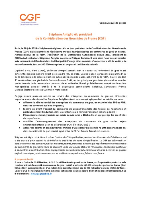 Stéphane Antiglio est élu ce jour président de la Confédération des Grossistes de France (CGF), qui rassemble 30 fédérations métiers représentatives du commerce de gros en France. Administrateur de la FEDA (Fédération de la Distribution Automobile) depuis 2011, président de PHE/Autodistribution, Stéphane Antiglio succède à Philippe Barbier.