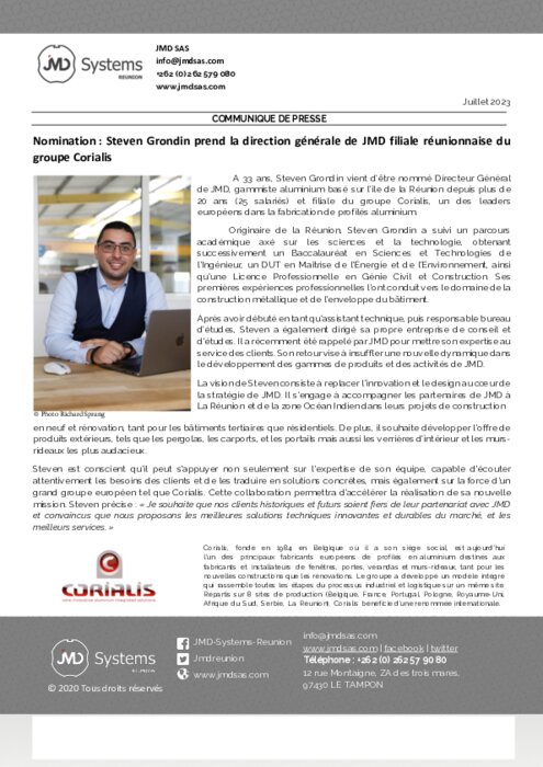 À 33 ans, Steven Grondin vient d’être nommé directeur général de JMD, gammiste aluminium basé sur l’île de la Réunion depuis plus de 20 ans (25 salariés) et filiale du groupe Corialis, un des leaders européens dans la fabrication de profilés aluminium.