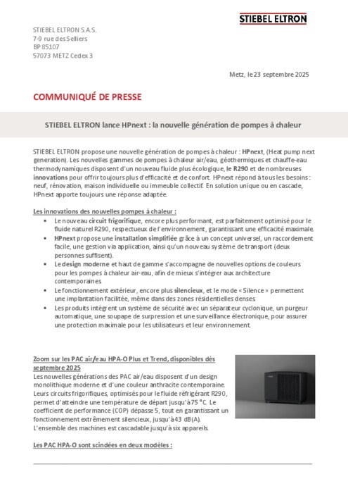Stiebel Eltron propose une nouvelle génération de pompes à chaleur : HPnext, (Heat pump next generation). Les nouvelles gammes de pompes à chaleur air/eau, géothermiques et chauffe-eau thermodynamiques disposent d’un nouveau fluide plus écologique, le R290 et de nombreuses innovations pour offrir toujours plus d’efficacité et de confort. HPnext répond à tous les besoins : neuf, rénovation, maison individuelle ou immeuble collectif. En solution unique ou en cascade, HPnext apporte toujours une réponse adaptée.