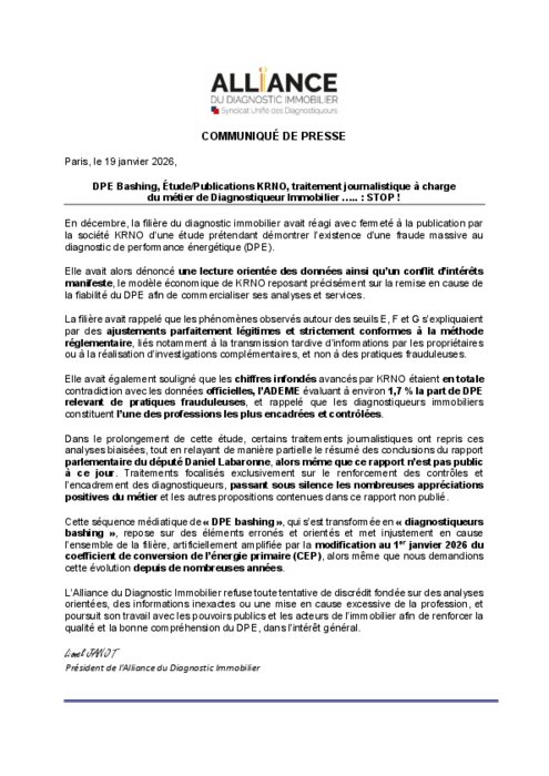 Cette séquence médiatique de "DPE bashing", qui s’est transformée en "diagnostiqueurs bashing", repose sur des éléments erronés et orientés et met injustement en cause l’ensemble de la filière, artificiellement amplifiée par la modification au 1er janvier 2026 du coefficient de conversion de l’énergie primaire (CEP), alors même que nous demandions cette évolution depuis de nombreuses années.