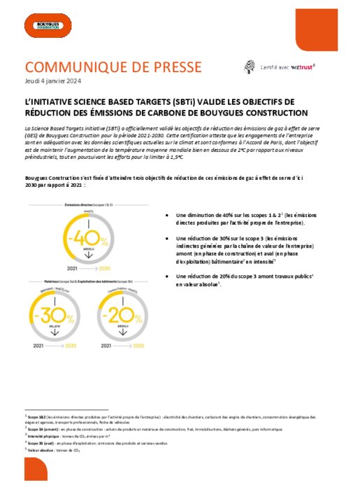 La Science Based Targets initiative (SBTi) a officiellement validé les objectifs de réduction des émissions de gaz à effet de serre (GES) de Bouygues Construction pour la période 2021-2030. Cette certification atteste que les engagements de l’entreprise sont en adéquation avec les données scientifiques actuelles sur le climat et sont conformes à l’Accord de Paris.