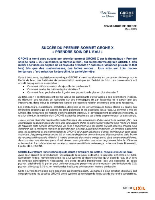 Grohe a mené avec succès son premier sommet Grohe X sur la thématique « Prendre soin de l’eau ». Du 7 au 9 mars, la marque a réuni, sur sa plateforme digitale Grohe X, des milliers de visiteurs de plus de 74 pays et a présenté 17 contenus (visionnés plus de 14 000 fois) tels que des masterclasses, des tables rondes… tous axés sur trois macro-tendances : l’urbanisation, la durabilité, la santé/bien-être.