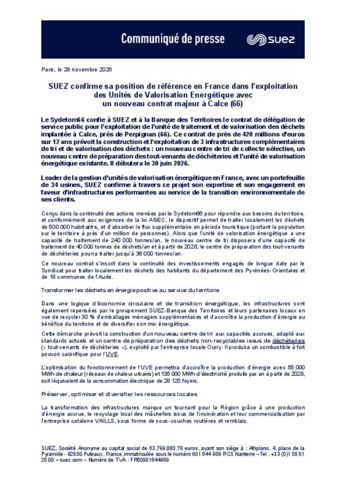 Le Sydetom66 confie à SUEZ et à la Banque des Territoires le contrat de délégation de service public pour l’exploitation de l’unité de traitement et de valorisation des déchets implantée à Calce, près de Perpignan (66). Ce contrat de près de 420 millions d’euros sur 12 ans prévoit la construction et l’exploitation de 3 infrastructures complémentaires de tri et de valorisation des déchets : un nouveau centre de tri de collecte sélective, un nouveau centre de préparation des tout-venants de déchèteries et l’unité de valorisation énergétique existante. Il débutera le 30 juin 2026.