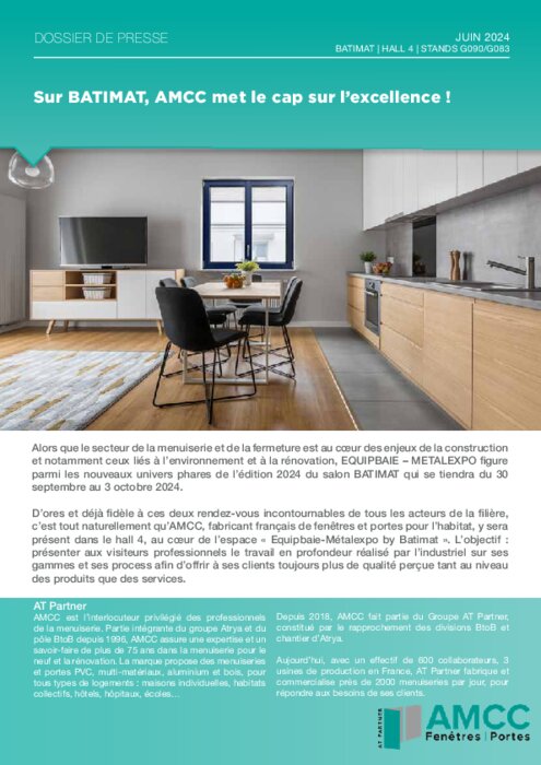Alors que le secteur de la menuiserie et de la fermeture est au cœur des enjeux de la construction et notamment ceux liés à l’environnement et à la rénovation, EQUIPBAIE – METALEXPO figure parmi les nouveaux univers phares de l’édition 2024 du salon BATIMAT qui se tiendra du 30 septembre au 3 octobre 2024. D’ores et déjà fidèle à ces deux rendez-vous incontournables de tous les acteurs de la filière, c’est tout naturellement qu’AMCC, fabricant français de fenêtres et portes pour l’habitat, y sera présent dans le hall 4, au cœur de l’espace « Equipbaie-Métalexpo by Batimat ».