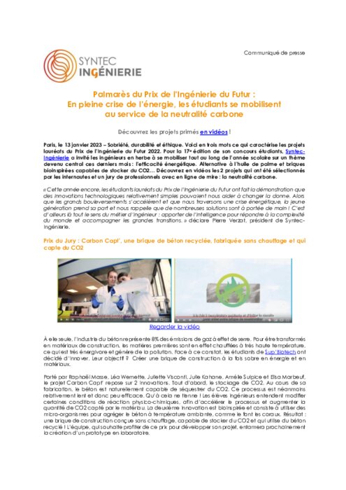 Pour la 17e édition de son concours étudiants, Syntec-Ingénierie a invité les ingénieurs en herbe à se mobiliser tout au long de l’année scolaire sur un thème devenu central ces derniers mois : l’efficacité énergétique. Alternative à l’huile de palme et briques bioinspirées capables de stocker du CO2… Découvrez en vidéos les 2 projets qui ont été sélectionnés par les internautes et un jury de professionnels avec en ligne de mire : la neutralité carbone.