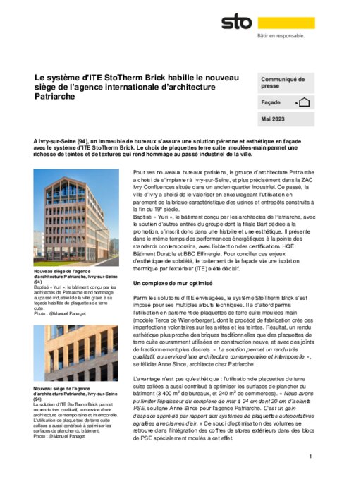A Ivry-sur-Seine (94), un immeuble de bureaux s’assure une solution pérenne et esthétique en façade avec le système d’ITE StoTherm Brick. Le choix de plaquettes terre cuite moulées-main permet une richesse de teintes et de textures qui rend hommage au passé industriel de la ville.