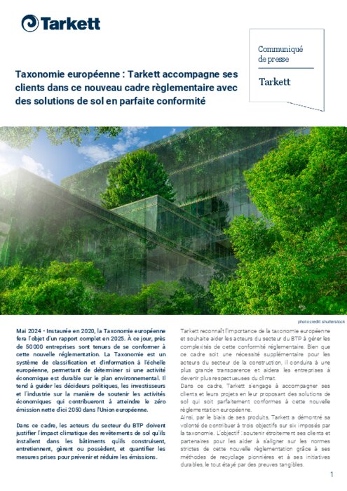 Tarkett reconnaît l’importance de la taxonomie européenne et souhaite aider les acteurs du secteur du BTP à gérer les complexités de cette conformité réglementaire. Bien que ce cadre soit une nécessité supplémentaire pour les acteurs du secteur de la construction, il conduira à une plus grande transparence et aidera les entreprises à devenir plus respectueuses du climat.