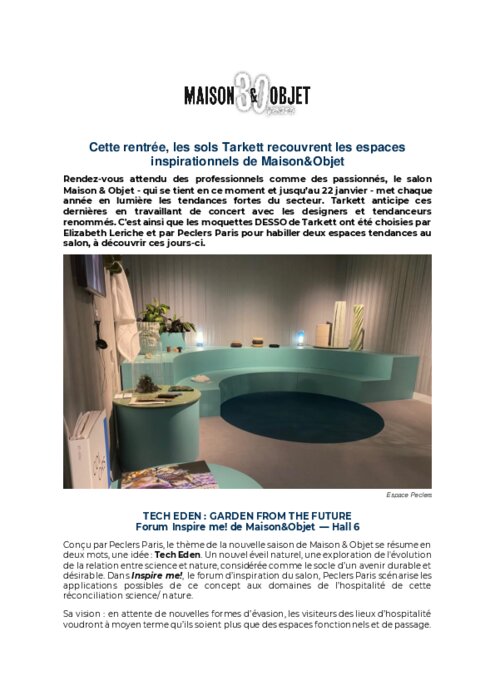 Rendez-vous attendu des professionnels comme des passionnés, le salon Maison & Objet - qui se tient en ce moment et jusqu’au 22 janvier - met chaque année en lumière les tendances fortes du secteur. Tarkett anticipe ces dernières en travaillant de concert avec les designers et tendanceurs renommés. C'est ainsi que les moquettes DESSO de Tarkett ont été choisies par Elizabeth Leriche et par Peclers Paris pour habiller deux espaces tendances au salon, à découvrir ces jours-ci.