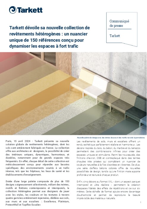 Tarkett présente sa nouvelle solution globale de revêtements hétérogènes, dont les sols sont entièrement fabriqués en France. La collection offre aux architectes et designers, la possibilité de créer des intérieurs uniques, dynamiques, harmonieux, et durables, notamment pour de grands espaces très fréquentés. En effet, chaque détail de cette collection est méticuleusement conçu pour répondre aux besoins spécifiques des environnements soumis à un trafic intense, tels que les hôpitaux, les lieux de santé et les établissements d'enseignement.