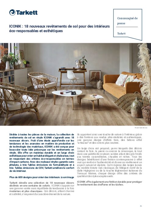 Dédiée à toutes les pièces de la maison, la collection de revêtements de sol en vinyle ICONIK s’agrandit avec 18 nouveaux décors. Fruit d’une étude approfondie sur les tendances et les avancées en matière de production et de technologie des matériaux, ICONIK a été conçue pour bousculer toute idée préconçue sur les revêtements en vinyle. Elle offre un matériau durable et un large choix esthétique pour créer un habitat élégant et chaleureux, tout en respectant des critères éco-responsables.