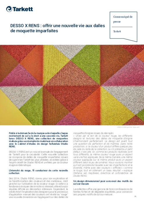 Fidèle à la démarche de la marque selon laquelle chaque revêtement de sol a le droit à une seconde vie, Tarkett intègre à son exposition évènement Rest+Art, l'histoire de la circularité, DESSO X RENS, une collection de moquettes réalisée grâce au réemploi de matériaux en collaboration avec le cabinet d’études de design hollandais Studio RENS. Cette collection est visite au sein de l'exposition, à l'Atelier Tarkett, jusqu'au début de l'été.