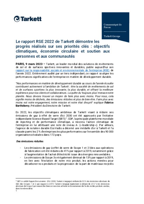 Tarkett, un leader mondial des solutions de revêtements de sol et de surfaces sportives innovantes et durables, publie aujourd'hui son rapport sur la responsabilité sociale et environnementale de l'entreprise (RSE) de l’année 2022. Entièrement audité par un tiers indépendant, ce rapport souligne les performances significatives de l'entreprise en matière de développement durable.