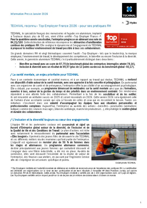 Pour la quatrième année consécutive, l’entreprise progresse en obtenant une note de 84,21/100. Cette distinction de référence récompense les démarches d’amélioration continue des pratiques RH. Elle souligne le dynamisme et l’engagement de TECHNAL à proposer le meilleur environnement de travail possible à tous ses collaborateurs.