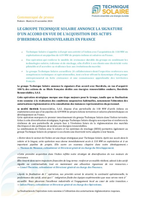 Le groupe Technique Solaire annonce la signature d'un accord en vue de l'acquisition de 100% des actifs d'Iberdrola renouvelables en France. Cette opération stratégique marque une étape majeure pour le Groupe (sa finalisation restant soumise à l'obtention des autorisations reglémentaires), qui réalise ainsi son premier investissement dans l'éolien terrestre.
