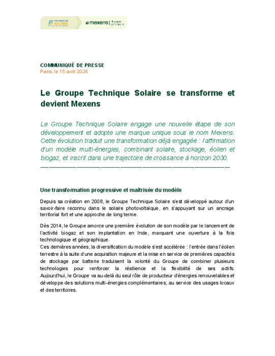 Le Groupe Technique Solaire engage une nouvelle étape de son développement et adopte une marque unique sous le nom Mexens. Cette évolution traduit une transformation déjà engagée : l’affirmation d’un modèle multi‑énergies, combinant solaire, stockage, éolien et biogaz, et inscrit dans une trajectoire de croissance à horizon 2030.