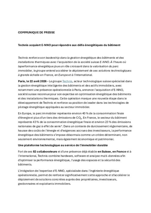 Technis renforce son leadership dans la gestion énergétique des bâtiments et des installations thermiques avec l’acquisition de la société suisse E-NNO. À l’heure où laperformance énergétique joue un rôle croissant dans la valorisation du parc immobilier, le groupe entend accélérer le déploiement de ses solutions technologiques à grande échelle en France, en Europe et à l’international.