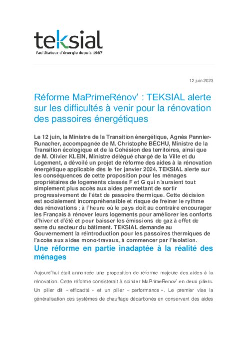 Le 12 juin, la Ministre de la Transition énergétique, Agnès Pannier-Runacher, accompagnée de M. Christophe BÉCHU, Ministre de la Transition écologique et de la Cohésion des territoires, ainsi que de M. Olivier KLEIN, Ministre délégué chargé de la Ville et du Logement, a dévoilé un projet de réforme des aides à la rénovation énergétique applicable dès le 1er janvier 2024. TEKSIAL alerte sur les conséquences de cette proposition pour les ménages propriétaires de logements classés F et G.